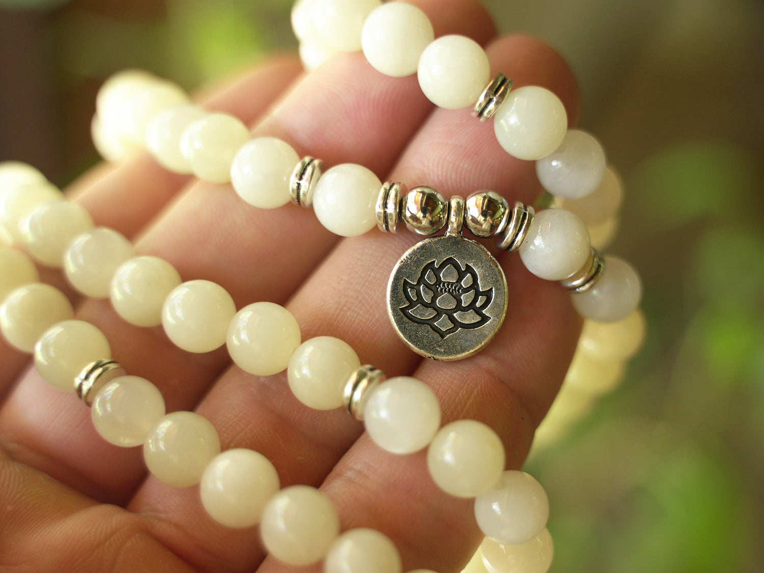 JAPA MALA 96 CUENTAS PIEDRA LUNA + DETALLE ACERO INOXIDABLE