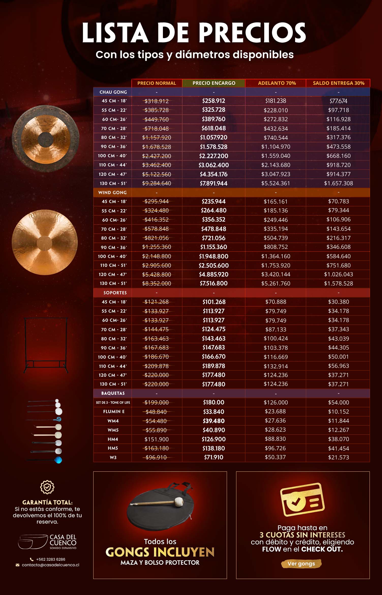 Nuestros gongs son fabricados por la reconocida marca Arborea Cymbals, establecidos desde 1996 como unos de los principales fabricantes de gongs en la tierra del dragón 🐉. Para asegurar el tuyo deberás abonar el 70% de su valor, el 30% restante se cancela contra entrega al momento de su llegada. Zarparán a Chile por vía marítima directa desde Zhangqiu, Shandong, China, con fecha estimada de arribo estimado para los últimos días de marzo 🚢.